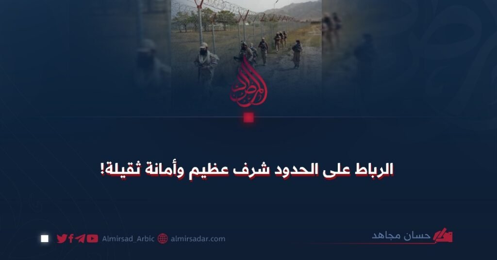 والآن، بينما جنود الإمارة الإسلامية يحمون الحدود والحدود السياسية، فهم إلى جانب استحقاقهم للفضل المشار إليه أعلاه، يتحمَّلون مسؤولية عظيمة. فهم يسيطرون على نقاط حساسة في البلاد تتعرّض للهجوم أولًا؛ ولهذا عليهم أن يتعاملوا مع عملهم بجدّية وحرص؛ فهم يدافعون على حدود البلد نيابةً عن نظامٍ إسلاميٍّ فريدٍ وأمّةٍ شريفة، وليسوا كقواتٍ عسكريةٍ تحمي أنظمة طاغية.